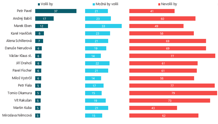 Pavla by v současnosti volilo 37 procent dotázaných a dalších 21 procent by jeho volbu zvažovalo. Babiše by volilo 17 procent lidí, dalších 23 procent by jeho volbu zvažovalo.