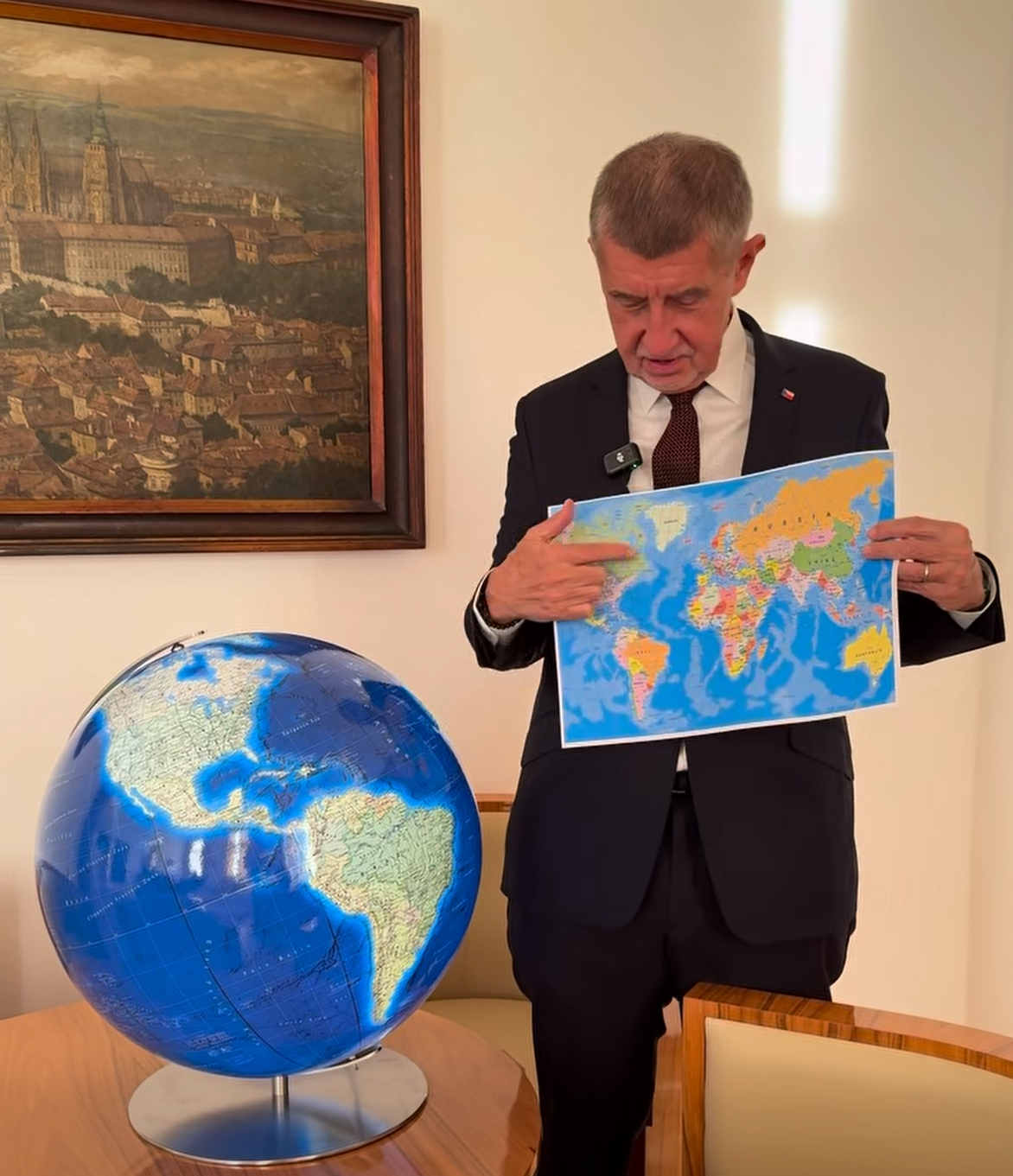Následně Babiš představil svůj nově zakoupený glóbus a pokusil se vysvětlit, v čem je glóbus lepší než obyčejná mapa.
